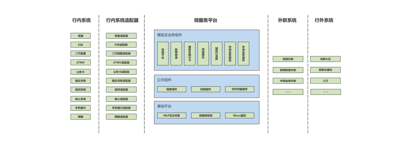 以技术中心、业务元件和场景模型等维度对前置业务进行工厂化重构,技术上采用服务治理平台完成技术组装,管理上采用服务资产管理平台对相关成果 统一的管理。平台由三大部分组成:行内系统适配器(实现行内系统接入微服务平台的适配)、微服务平台(实现业务的流程处理和持久化管理,给予监控及管理功能)、外联平台(实现行内系统与行外系统之间的通讯,屏蔽各个三方系统的通讯差异)。